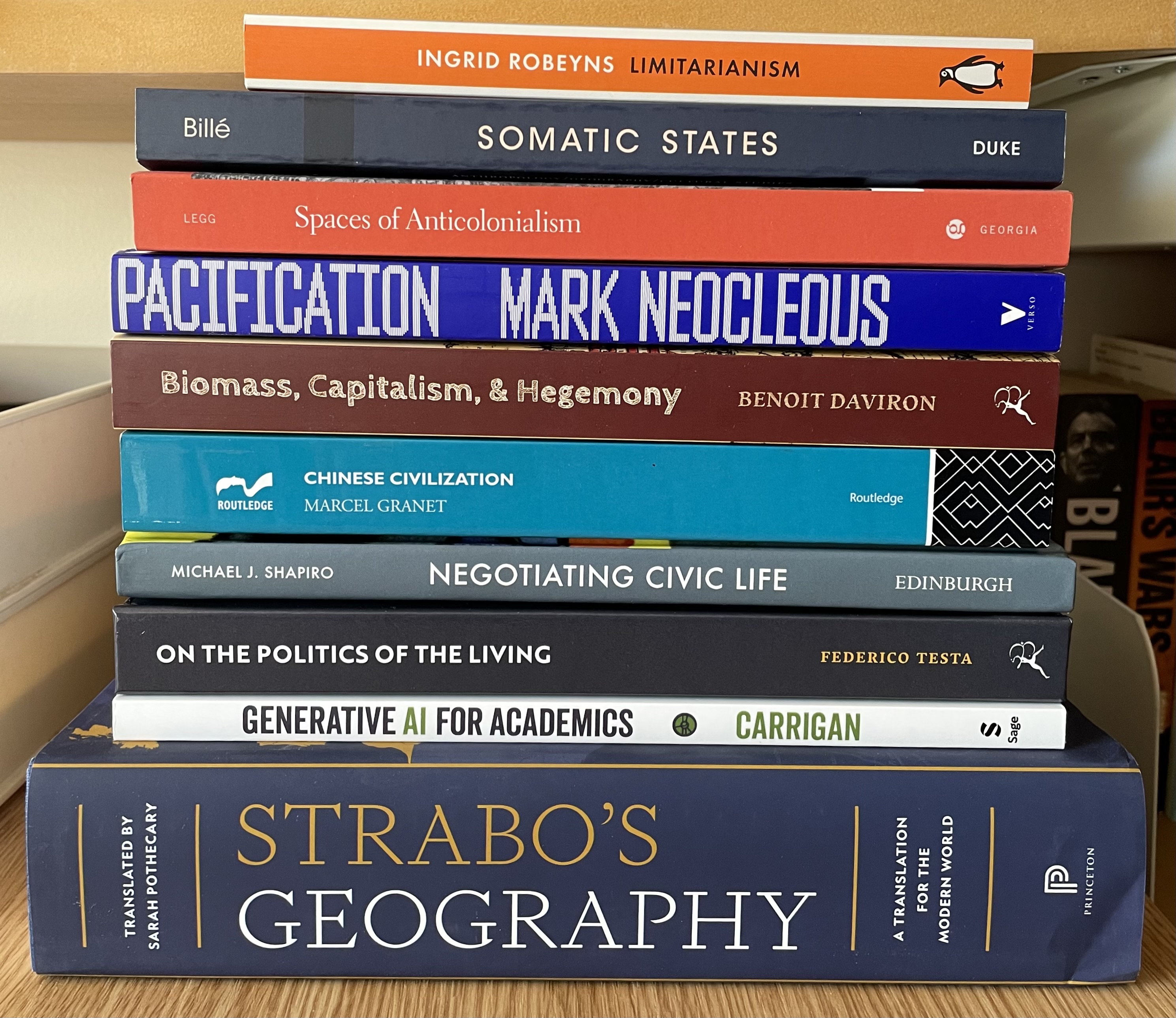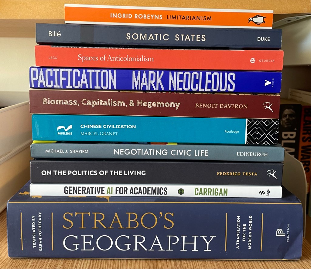 Books generously sent to me by publishers, authors or editors. Ingrid Robeyns, Limitarianism; Franck Billé, Somatic States: On Cartography, Geobodies, Bodily Integrity; Stephen Legg, Spaces of Anticolonialism: Delhi’s Urban Governmentalities; Mark Neocleous, Pacification: Social War and the Power of Police; Benoit Daviron, Biomass, Capitalism & Hegemony; Marcel Granet, Chinese Civilisation; Michael J. Shapiro, Negotiating Civic Life: Literature, Film, Politics; Federico Testa, On the Politics of the Living: Foucault and Canguilhem on Life and Norms; Mark Carrigan, Generative AI for Academics; Sarah Pothecary, Strabo’s Geography: A Translation for the Modern World.