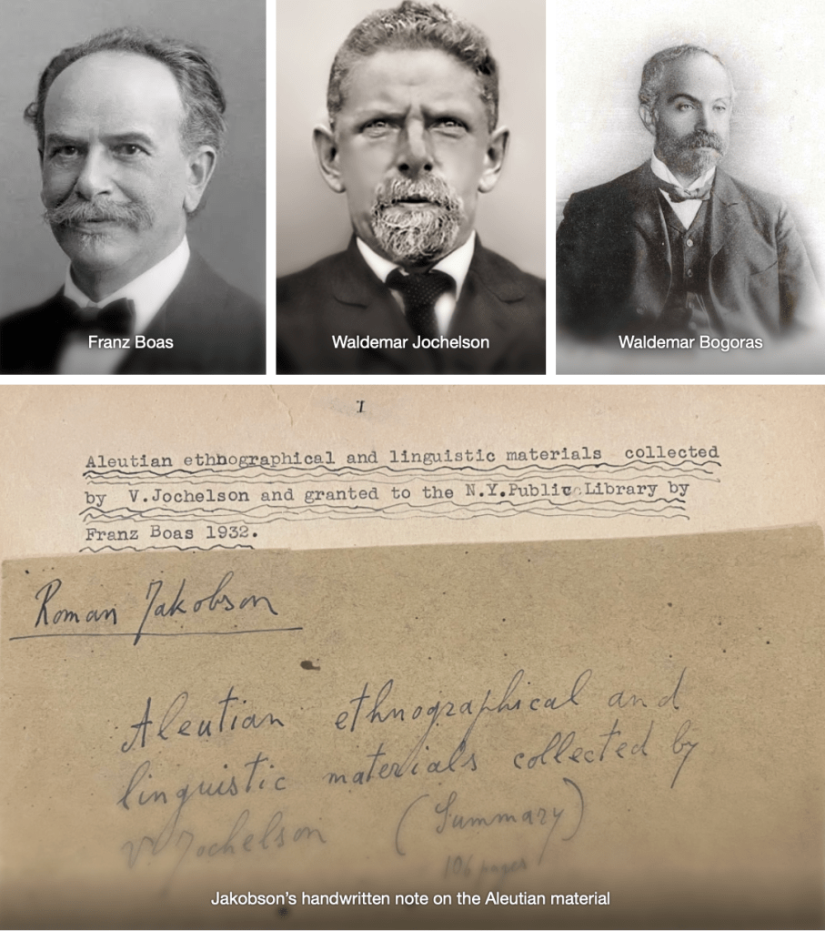 But his first work in the United States was a bit different than going straight into teaching. He worked for the New York Public Library (NYPL) on some Aleutian material collected by the anthropologist Franz Boas, and later on other languages spoken across eastern Siberia and Alaska. The work concerned collections originally made by Waldemar Jochelson in the Aleutian Islands and Kamchatka in 1909-10 for the Russian Geographical Society, and Waldemar Bogoras’s ethnographic papers from time in the northeast of Siberia in 1901. In June 1941 the NYPL asked the Emergency Committee if they could supplement the $50 per month they could afford to pay Jakobson in order for him to catalogue and organise the material. They said Jakobson’s specialism in East Siberian languages would make him well placed to work on these papers.