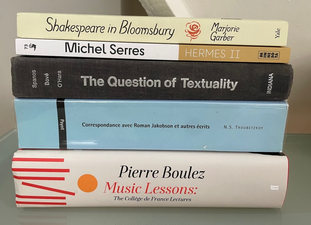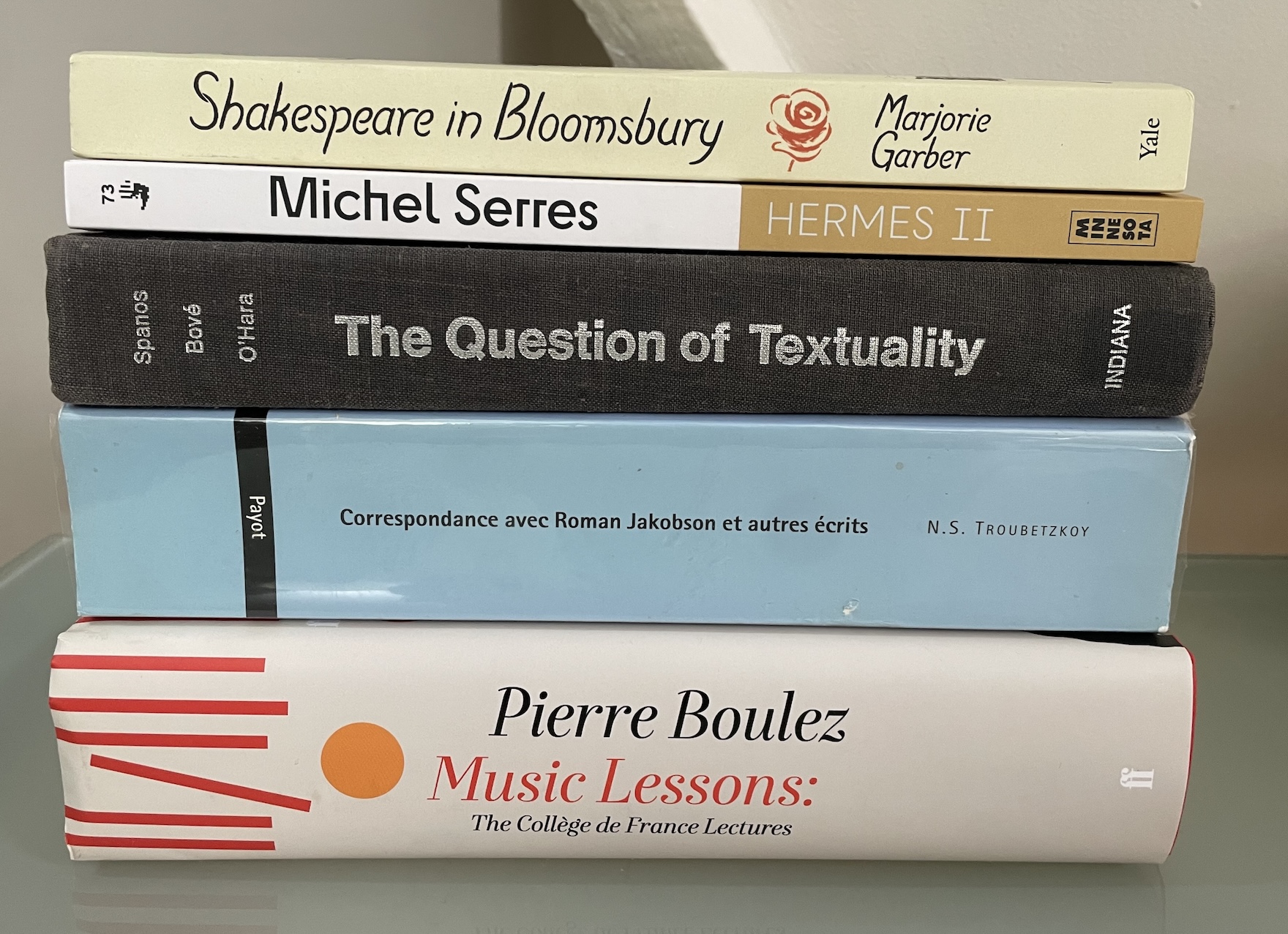 Marjorie Garber, Shakespeare in Bloomsbury, now in paperback; Michel Serres, Hermes II: Interference; the older collection The Question of Textuality: Strategies of Reading in Contemporary American Criticism; Nikolai Trubetzkoy’s correspondence with Roman Jakobson in French translation; and Pierre Boulez’s lectures at the Collège de France. University of Minnesota Press sent the translation of Serres, and the others were bought new or second-hand.