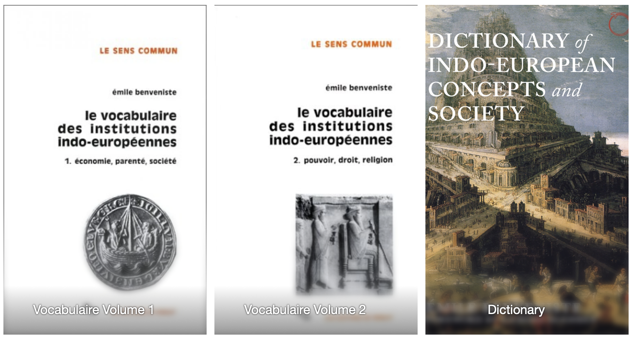 Émile Benveniste, Le Vocabulaire des institutions indo-européennes, 2 volumes, Paris: Éditions de Minuit, 1969; Dictionary of Indo-European Concepts and Society, trans. Elizabeth Palmer, Chicago: Hau Books, 2016; originally published as Indo-European Language and Society, Coral Gables: University of Miami Press, 1973.