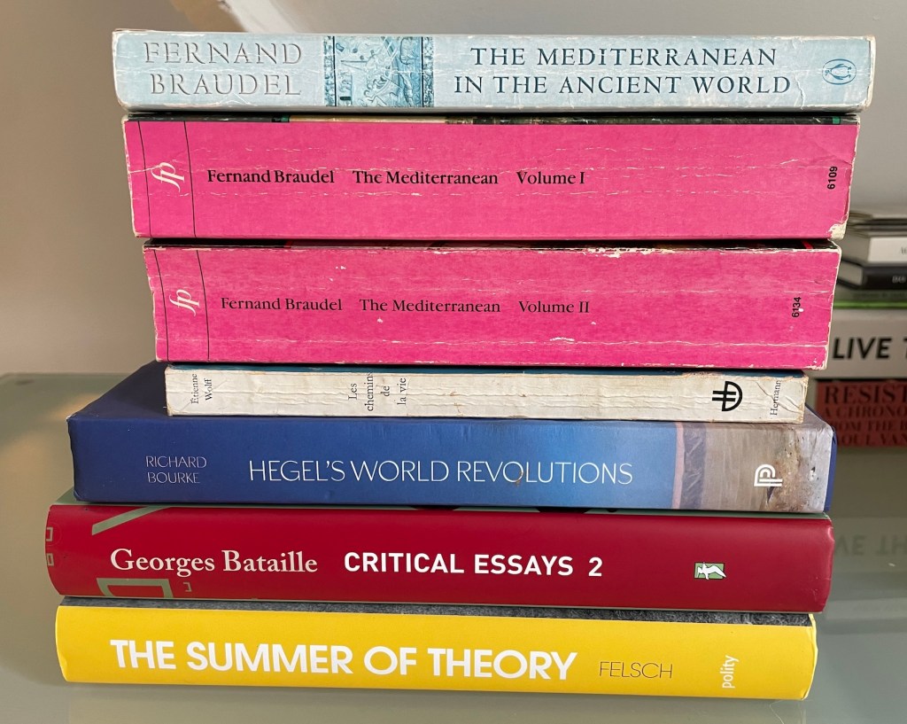 Some second-hand copies of Fernand Braudel, and Etienne Wolff’s Les chemins de la vie, and copies of Richard Bourke, Hegel’s World Revolutions, Georges Bataille, Critical Essays 2, and Philipp Felsch, The Summer of Theory: History of a Rebellion, 1960-1990.