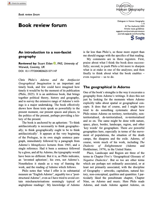My review, “An introduction to a non-fascist geography“, of Chris Philo, Adorno and the Anti-Fascist Geographical Imagination (Edinburgh University Press, 2025) is now published online first in Dialogues in Human Geography. If you’d like to read it and can’t access through an institution, the preprint is here or please ask me for a copy. It will be part of a review forum with other contributions and a reply by Chris.