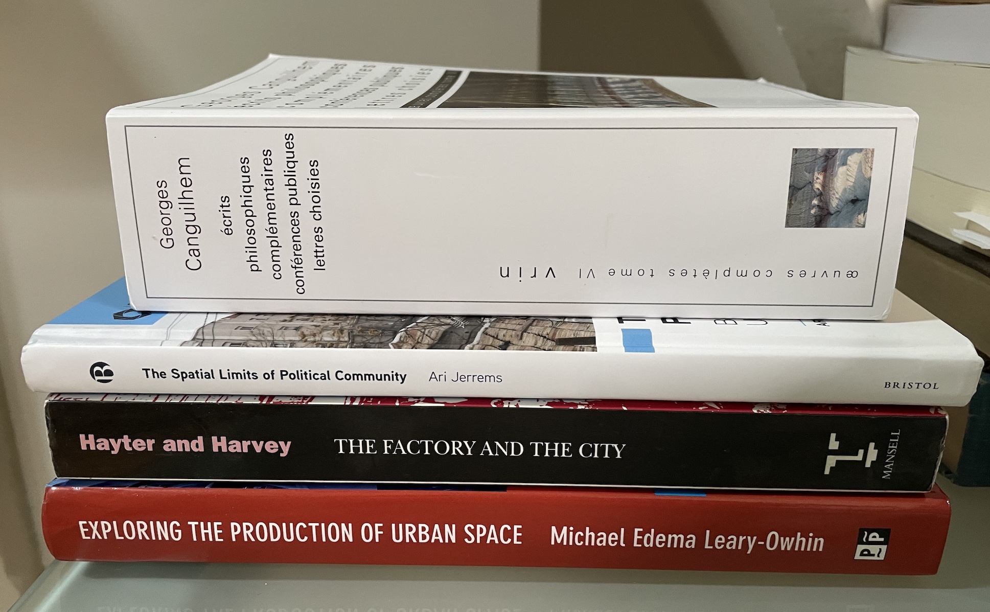 The final volume of Georges Canguilhem, Oeuvres complètes, Ari Jerrems, The Spatial Limits of Political Community, Teresa Hayter and David Harvey, The Factory and the City: The Story of the Cowley Automobile Workers in Oxford and Michael Edema Leary-Ohwin, Exploring the Production of Urban Space.