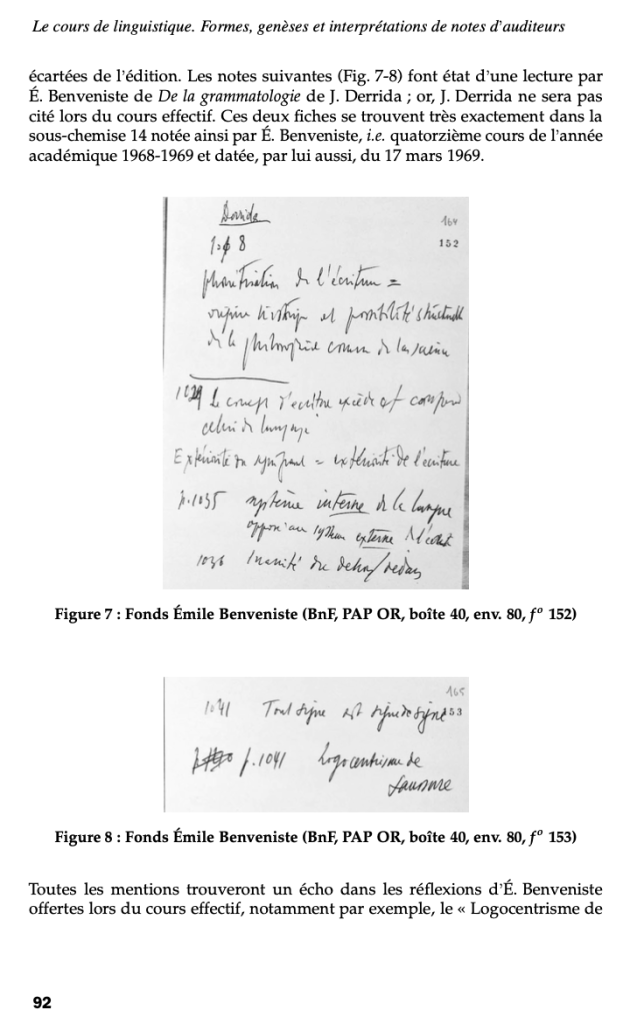 In another one of her articles, “Éditer un cours de linguistique générale à partir d’archives manuscrites”, Fenoglio says these notes “refer to E. Benveniste’s reading of Derrida’s De la grammatologie” (p. 92) The notes which prove this, she claims, are found in the subfolder of the 14th lecture of the course, dated to 17 March 1969. She indicates that this is important even if “Derrida is not cited in the actual lecture” (p. 92). Fenoglio reproduces those pages in her chapter, p. 169, and her article, p. 92. I have learned a great deal from Fenoglio and Joseph’s work – he is the author of a magisterial biography of Saussure, for example, and Fenoglio has edited and interpreted various texts from Benveniste’s archives (see also her “Le fonds Émile Benveniste de la BnF est-il prototypique?”). But on this point about Benveniste reading Derrida’s book, I’m not sure.