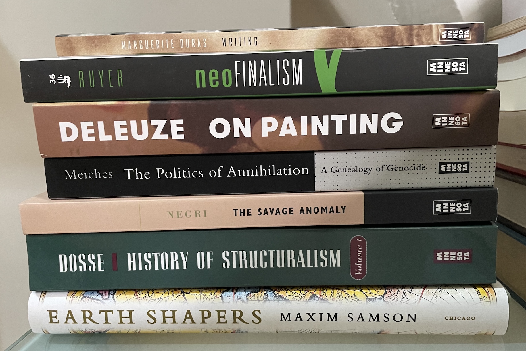 Mostly books from University of Minnesota Press, in recompense for review work, and Maxim Samson, Earth Shapers, sent by University of Chicago Press. The UMP books are Marguerite Duras, Writing; Raymond Ruyer, Neofinalism; Gilles Deleuze, On Painting; Benjamin Meiches, The Politics of Annihilation: A Genealogy of Genocide; Antonio Negri, The Savage Anomaly; and the first volume of François Dosse, History of Structuralism.