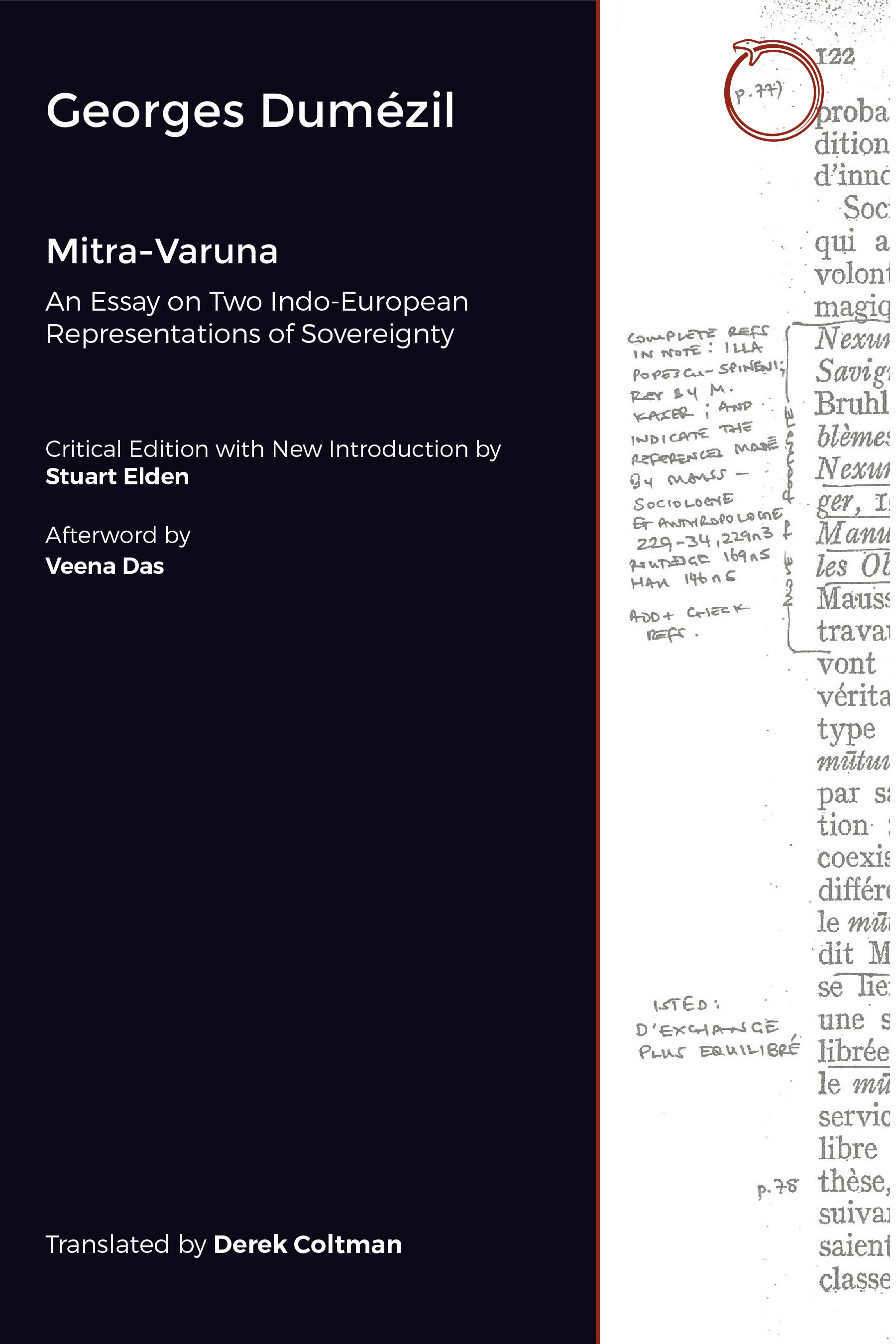 Even an owner of the second edition of Mitra-Varuna in French, or of the 1988 Zone Books edition of the translation by Derek Coltman, which forms the basis of the present book, would find much of additional value in the publication under review. (Stuart Elden, responsible for this slightly revised version of Coltman’s translation, points out that the Zone Books publication, like virtually all of the English translations of Dumézil’s work published over the past several decades, is out of print [p. xxiv].) As the cover of this book, brought out by Hau Books of Chicago, vividly shows, much of Dumézil’s revision of Mitra-Varuna evolved in the tiny notes he entered by hand into the margins of the printed first edition. Elden’s editorial work makes it possible for the reader to find the major changes between the two French editions, and to consult the more important original passages, mostly presented in both French and English translation, that have undergone substantial change. Helpfully, Elden has also clarified or corrected Dumézil’s sometimes telegraphic bibliographical references.