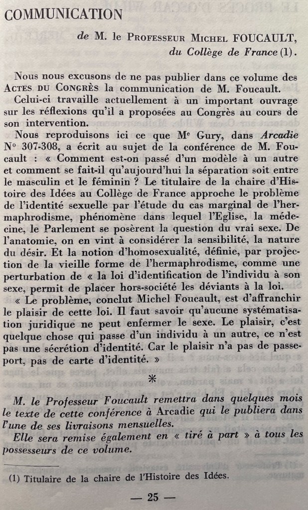 I made the claim that an unpublished text quoted by Arianna Sforzini in her editorial introduction to Les Hermaphrodites, also in the Foucault archives, was Foucault’s presentation to this conference. Having now seen the archival material myself, I am more confident in that claim. Here’s what I think we know about this event and Foucault’s talk.