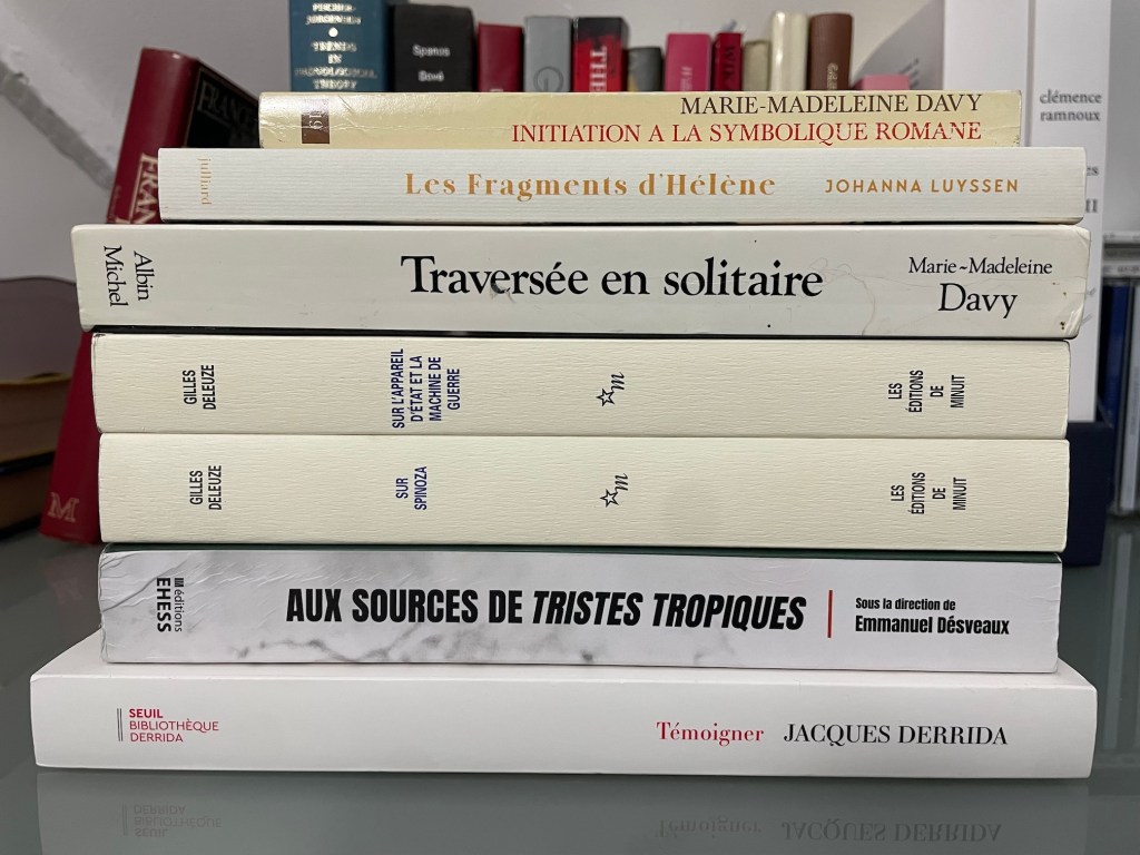 Some second-hand or new French books, including Johanna Luyssen, Les Fragments d’Hélène, Deleuze’s Sur l’appareil d’État et la machine de guerre: Cours novembre 1979-mars 1980 and Sur Spinoza, Aux sources de tristes tropiques. Les carnets de terrain de Claude et Dina Lévi-Strauss (1935-1939) and Derrida’s Témoigner: Séminaire (1992-1993).