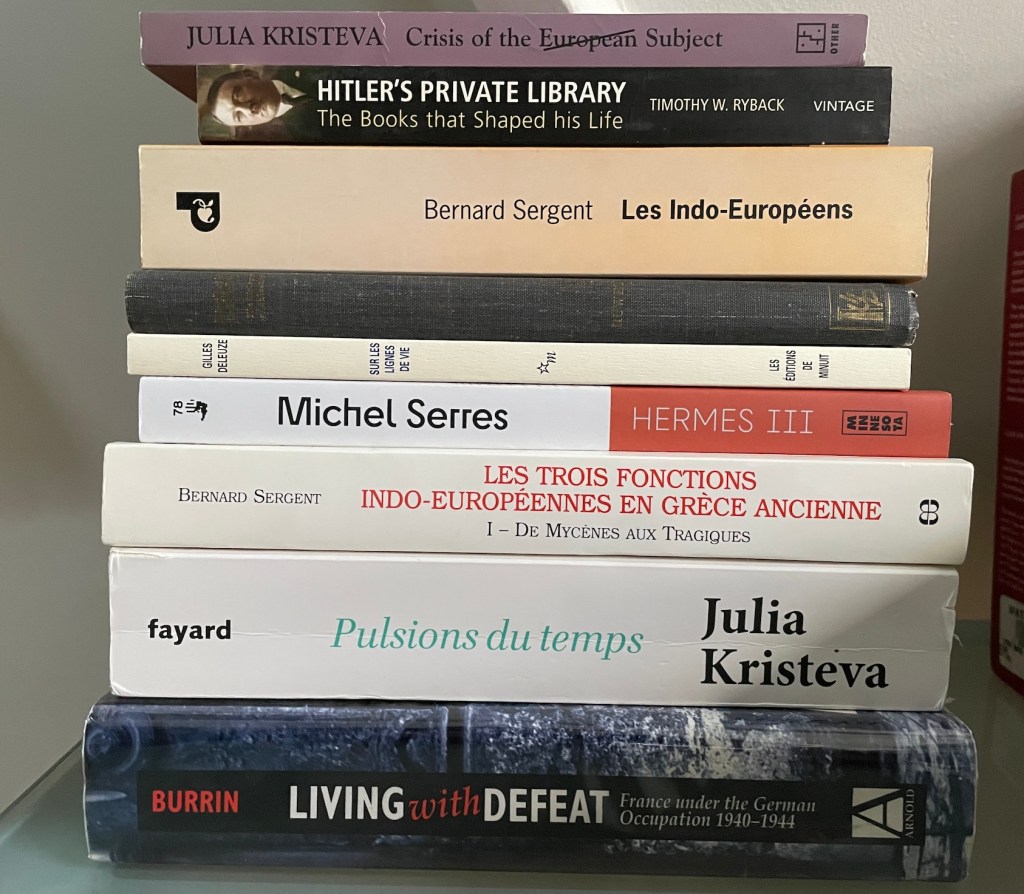 Mostly bought second-hand, but including Michel Serres, Hermes III, sent by University of Minnesota Press, and Gilles Deleuze, Sur les lines de vie. The one without a clear title on the spine is Jean-Claude Ruwet, Introduction to Ethology: The Biology of Behaviour. Ruwet’s work on territoriality was important for some of the French theorists I’m interested in. The others generally relate to my current Indo-European thought project.