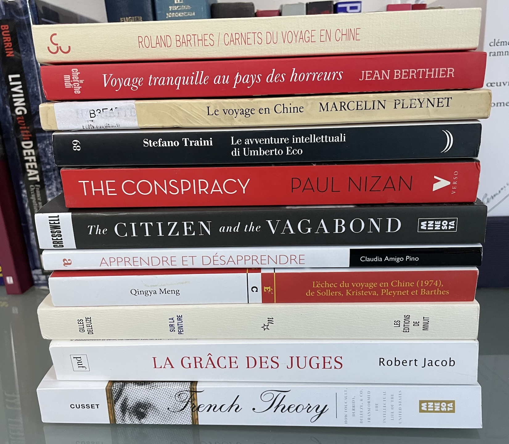I’ve been away for a while, so there were a few books waiting for me on my return. Several of these relate to a planned ‘Sunday History‘ on the Tel Quel visit to China – Jean Berthier’s recent book Voyage tranquille au pays des horreurs: Sollers, Barthes, Kristeva, Pleynet, Wahl… en Chine and some of the older ones on it. The pile also includes Gilles Deleuze, Sur la peinture, the first of his courses to be published – I already have the others out so far, and the English translation On Painting. Tim Cresswell’s The Citizen and the Vagabond: A Politics of Mobility was sent by University of Minnesota Press, François Cusset’s older French Theory was recompense for review work for them.