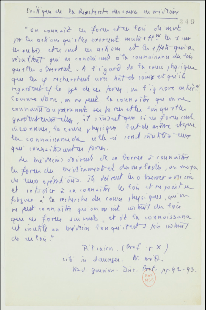 Les médecins doivent se borner à connaître les forces des médicaments et des maladies au moyen de leurs opérations ; ils doivent les observer avec soin et s’étudier à en connaître les lois, et ne point se fatigue à la recherche des causes physiques (Naissance de la clinique, 1st edition, p. 12; 2nd edition, p. 12; Quadrige edition, p. 33).