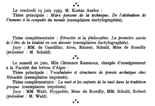 Report of the Axelos and Ramnoux thesis defences, “Nouvelles philosophiques”, Les Études philosophiques 14 (3), 1959, 405-12