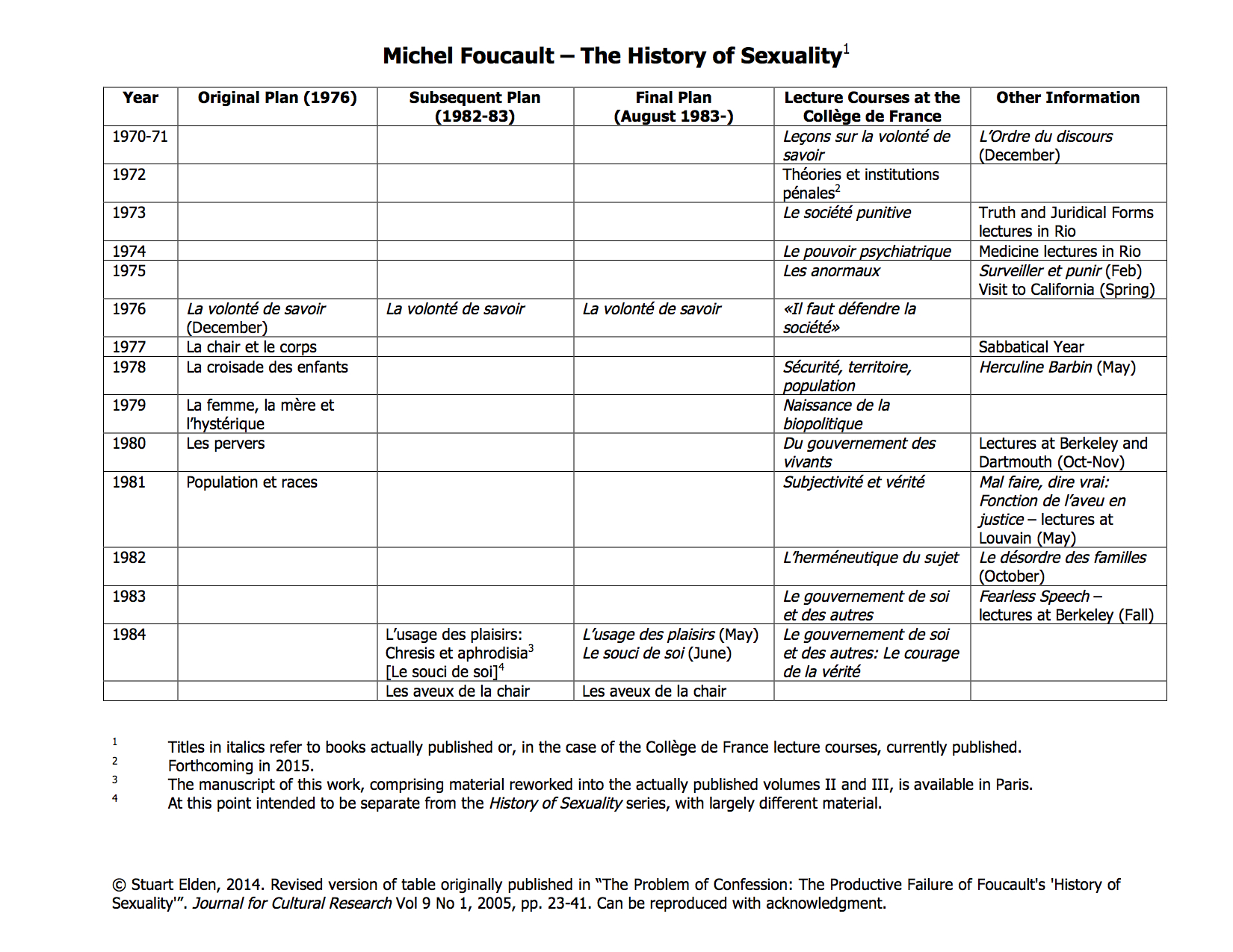 Foucault’s History of Sexuality – a table of Foucault’s various plans, with a list of his lecture courses and related material – last updated 9 November 2014 (pdf; jpg)