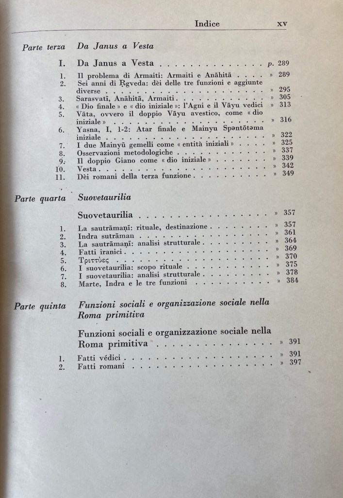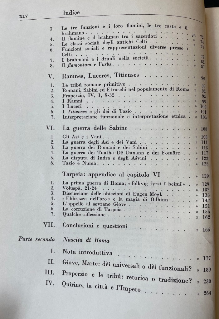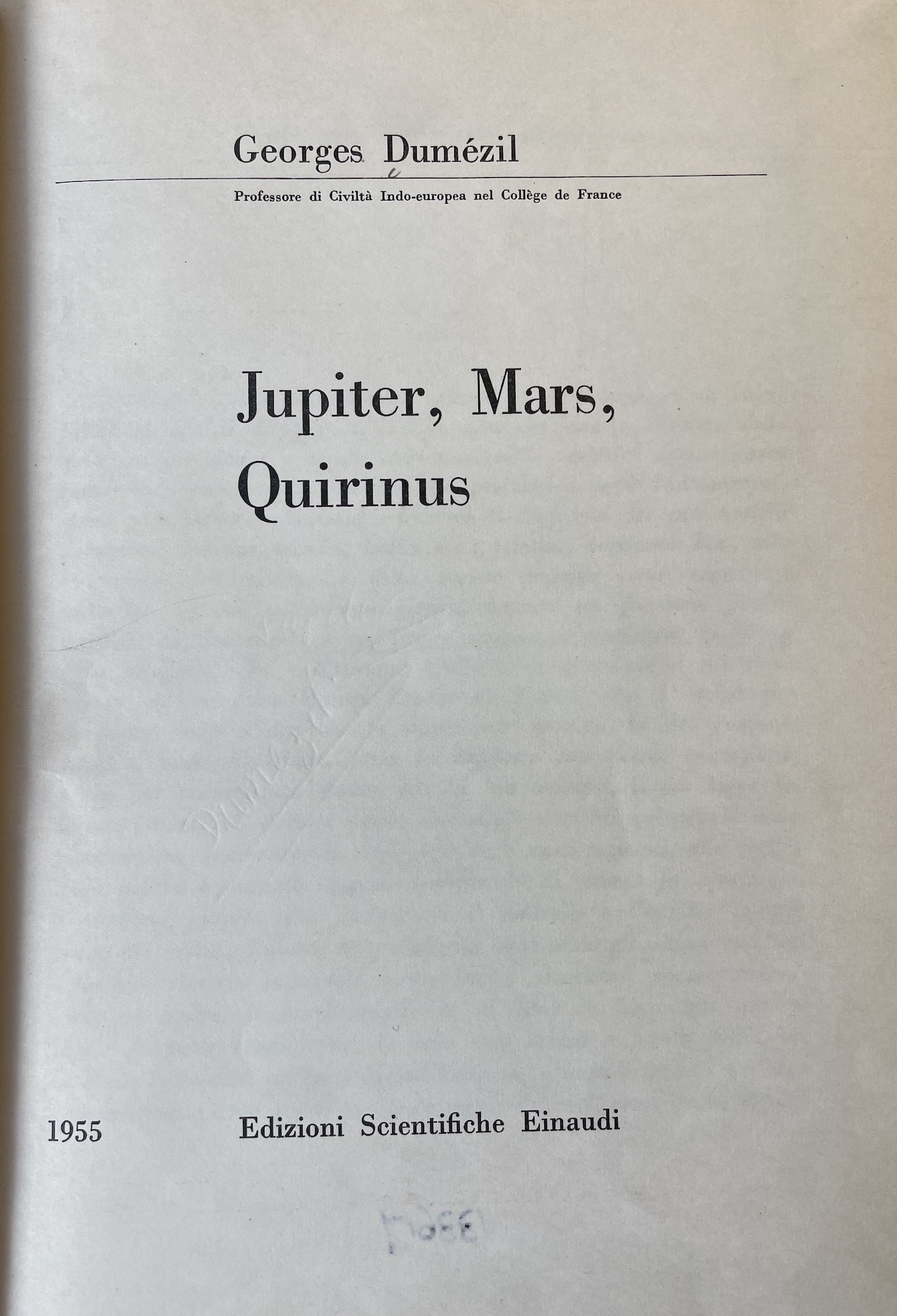 In other words, an Italian reader would have here most of two of Dumézil’s books [JMQ I and JMQ II], a substantial part of a third [Tarpeia, Chapters I, II and V], and part of a fourth [JMQ IV]. Tarpeia is not part of the Jupiter, Mars, Quirinus series in French.