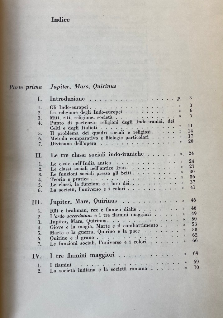The Italian Jupiter, Mars, Quirinus is not easy to find. Worldcat suggests only about 30 libraries have it, with only one copy in the UK and one in France. In his L’Œuvre de Georges Dumézil, Hervé Coutau-Bégarie provides a brief outline of what the Italian text contains (p. 43), but I wanted to see in more detail which bits of the Jupiter, Mars, Quirinus series were included, as would give an indication of Dumézil’s own sense of the most important parts of this work about a decade after most of the source texts were first published.